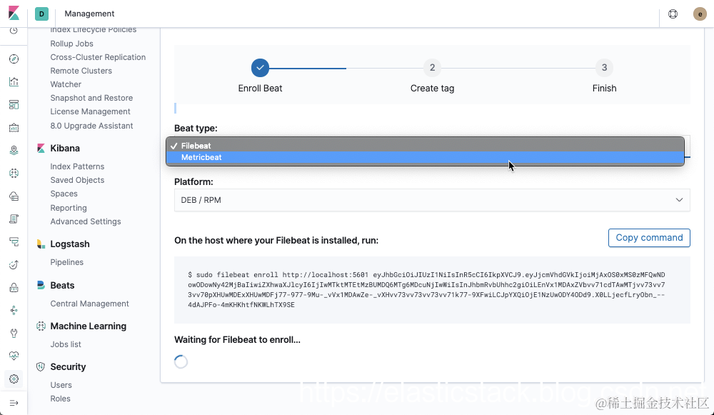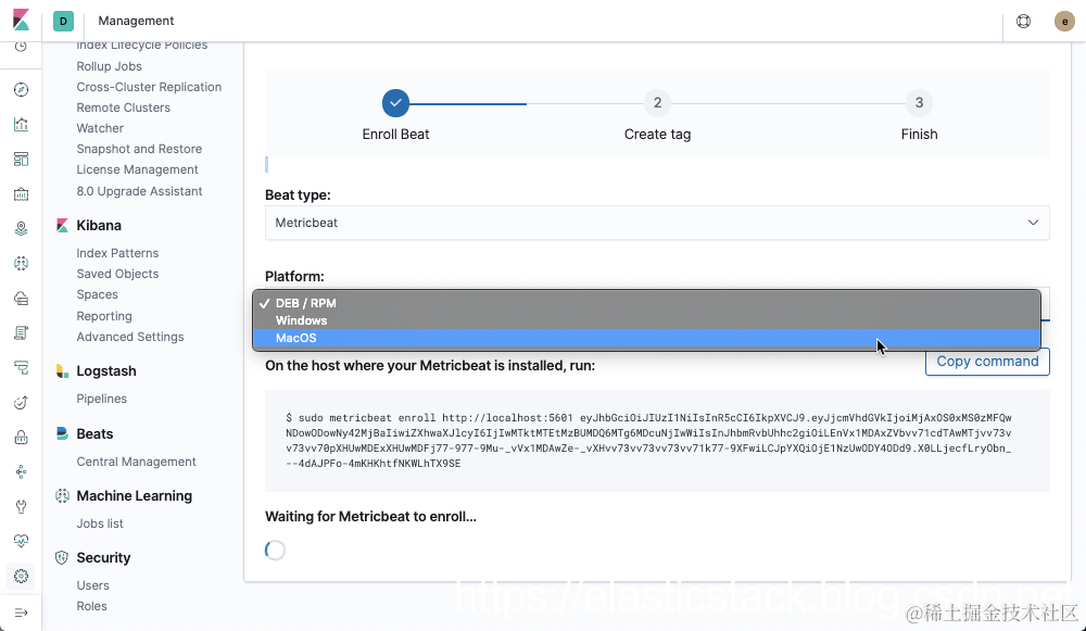 由于需要使用到Metricbeat。我们需要参照我之前的文章“Elastic Beats介绍”来安装我们的Metribeat。同时在我们的Terminal中打入从Copy Command处拷贝来的命令: