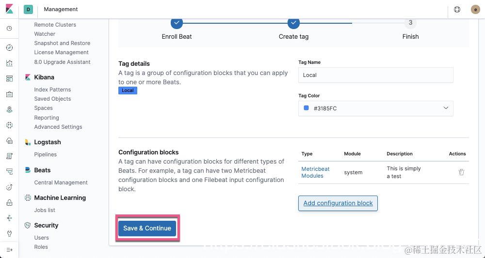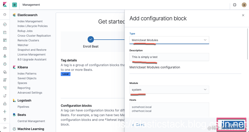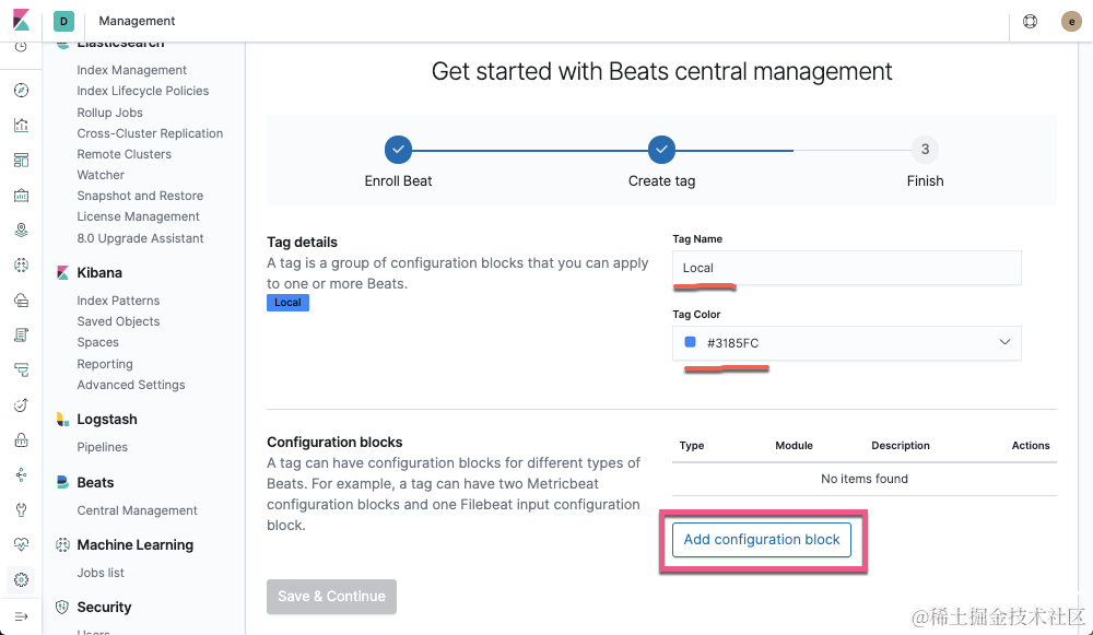 我们可以选一个我们喜欢的Tag Name和自己喜欢的颜色。在上面我选择了Local表明我的这个Metricbeat是在本地运行的。这样以后我们能很容易地找到我们的这个机器的配置。我们点击Add configuration block按钮: