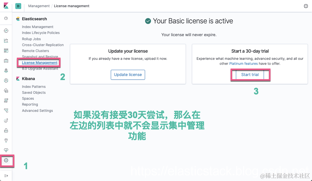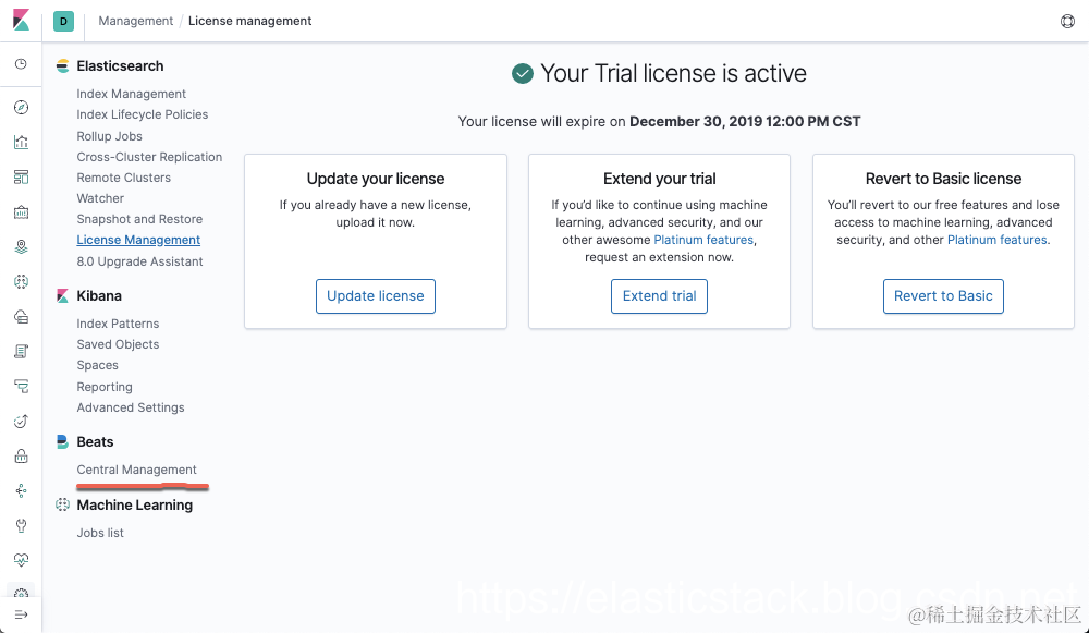 我们首先点击Kibana中的Management,让后选择30天尝试。当我们接受完条件后,我们可以看到: