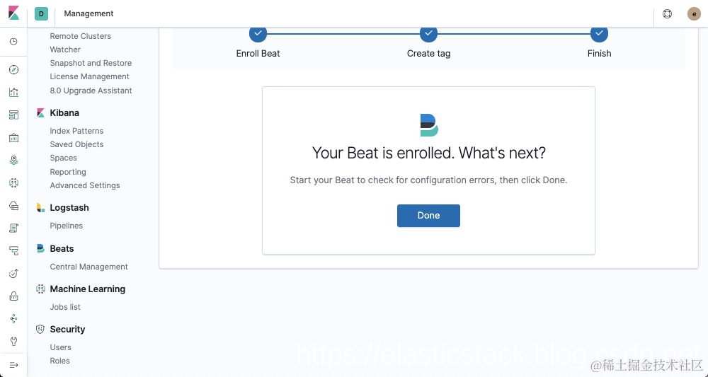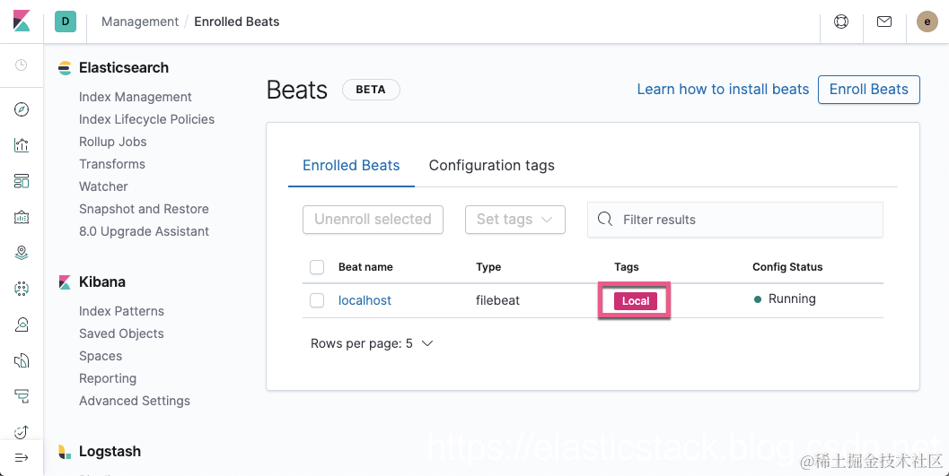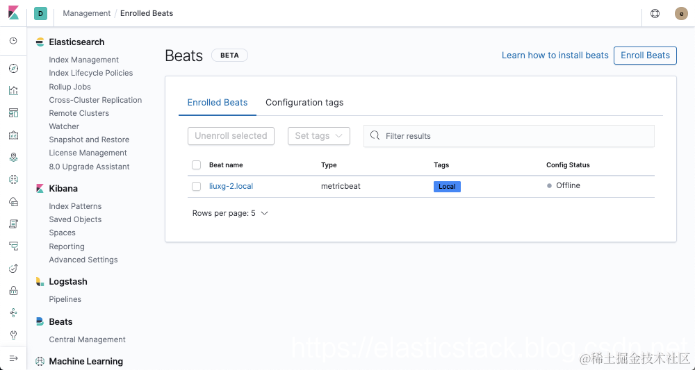 Elastic在Kibana中做进去一个新的功能:集中管理。Beats中央管理使用一种称为配置标签的机制来对相关配置进行分组。 注册第一个Beat后,您可以在Kibana的中央管理UI中定义配置标签。