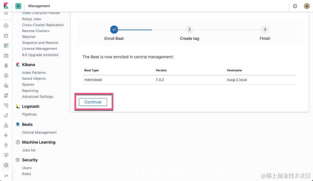 在上面显示了我的hostname以及metricbeat的版本信息。我们接下来选择Continue按钮: