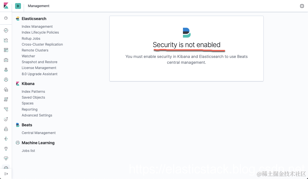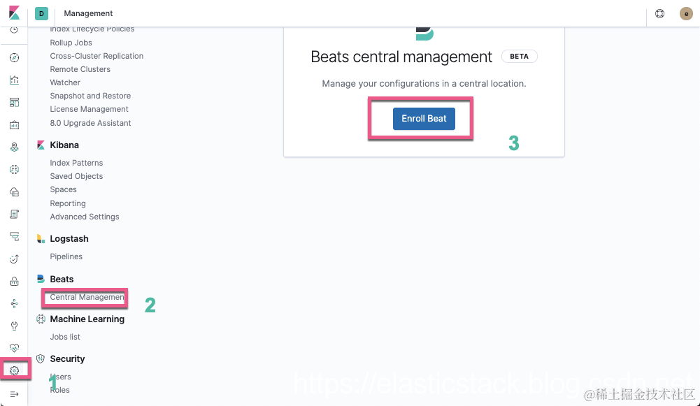 大家一定可以看到左边的列表会多了一个叫做Beats的种类,并在其下面有一个叫做Central Management的项。我们点击Central Management: