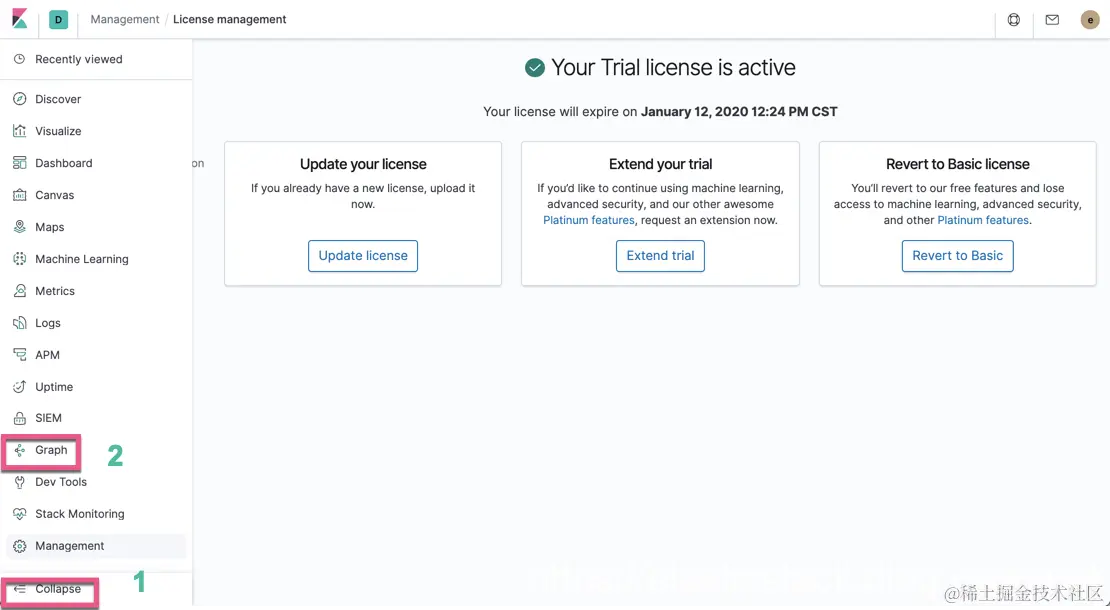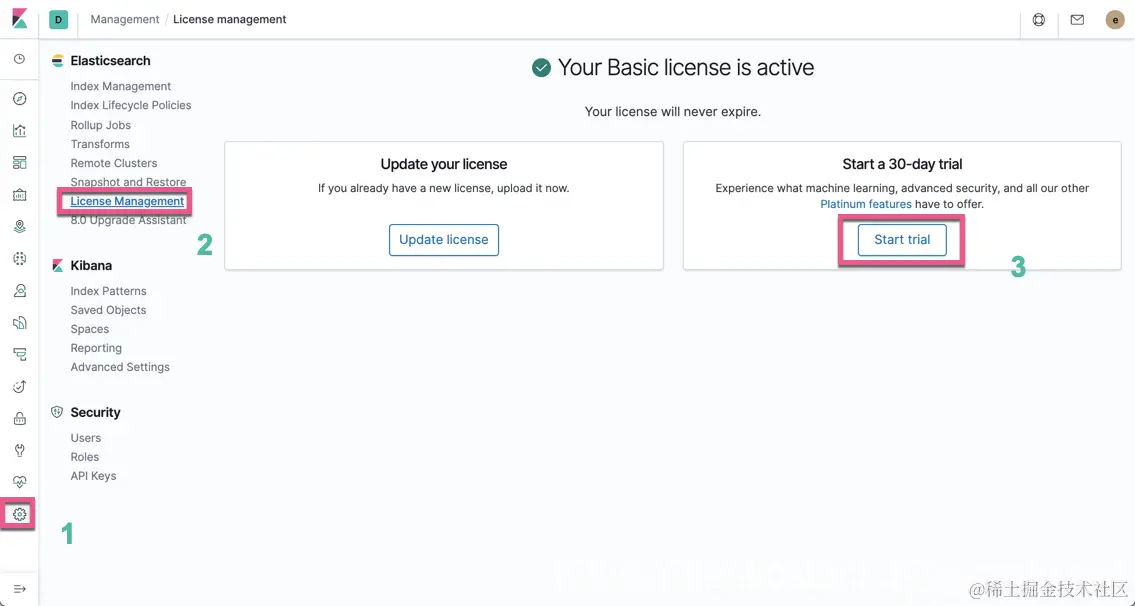 - 目前这个功能需要你需要打开Elasticsearch的安全功能才可以使用。如果你还不知道如何打开Elasticsearch的安全功能,你可以参考我的文章“Elasticsearch:设置Elastic账户安全”。