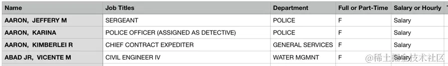 在今天的例子中,我们来使用一个来自互联网上的数据。我们可以在链接下载芝加哥城市人最新的工作人员的薪水及职位表单。