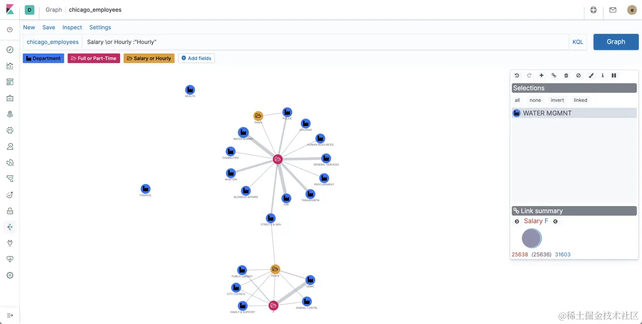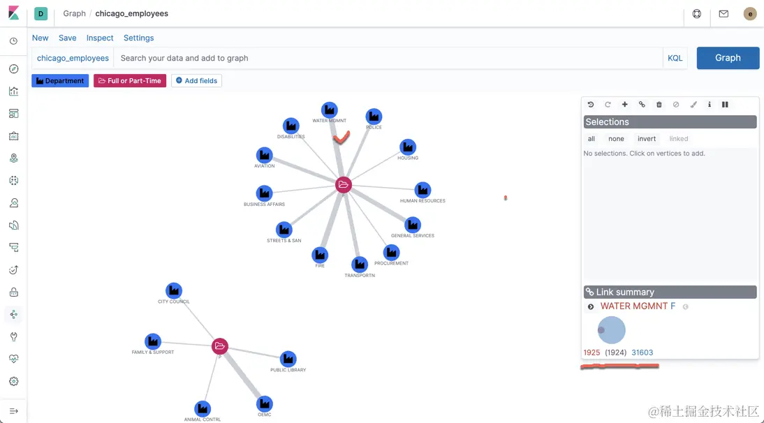 这里的线的粗细代表文档的关联的数量大小。从上面我们可以看出哪个部门的Full time的人最多 (FIRE部门),哪个部门Full time的最少 (DISABILITIES)。同时,我们可以可以看出来,针对Part-time的部门,那些是最多的,比如OEMC部门的Part-time的人是最多的。