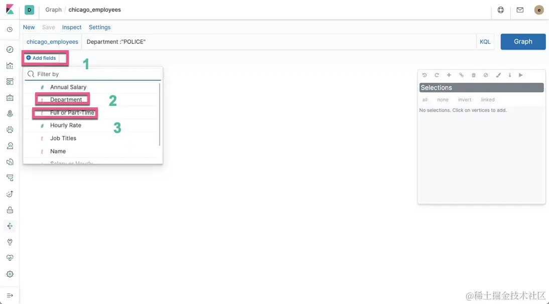 按照上面的顺序,我们点击Add fields来添加Full or Part-time和Department两个字段(我们可以分别定制两个字段的颜色及icon。记住我们必须选择keyword字段才可以。在供选择的字段里标识为“t”):