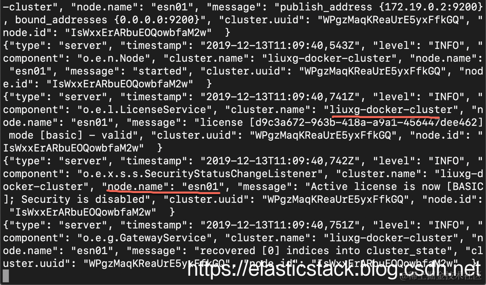 {“type”: “server”, “timestamp”: “2019–08–18T13:40:28,169+0000”, “level”: “INFO”, “component”: “o.e.c.s.ClusterApplierService”, “cluster.name”: “stanislavs-docker-cluster”, “node.name”: “esn01”, “cluster.uuid”: “ilHqkY4UQuSRYnE5hFbhBg”, “node.id”: “KKnVMTDwQR6tinaGW_8kKg”, “message”: “added {{esn02}{4xOwc-_fQDO_lwTlpPks2A}{FW-6YGVSSsmgEt3Mo_GY_Q}{172.18.0.3}{172.18.0.3:9300}{dim}{ml.machine_memory=8360488960, ml.max_open_jobs=20, xpack.installed=true},}, term: 1, version: 16, reason: Publication{term=1, version=16}” }