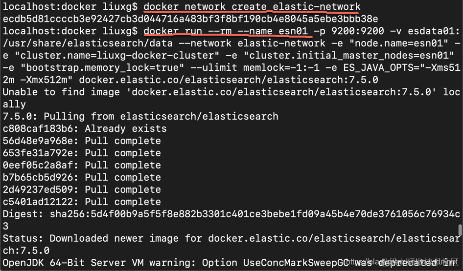 docker run --rm --name esn01 -p 9200:9200 -v esdata01:/usr/share/elasticsearch/data --network elastic-network -e "node.name=esn01" -e "cluster.name=liuxg-docker-cluster" -e "cluster.initial_master_nodes=esn01" -e "bootstrap.memory_lock=true" --ulimit memlock=-1:-1 -e ES_JAVA_OPTS="-Xms512m -Xmx512m" docker.elastic.co/elasticsearch/elasticsearch:7.5.0