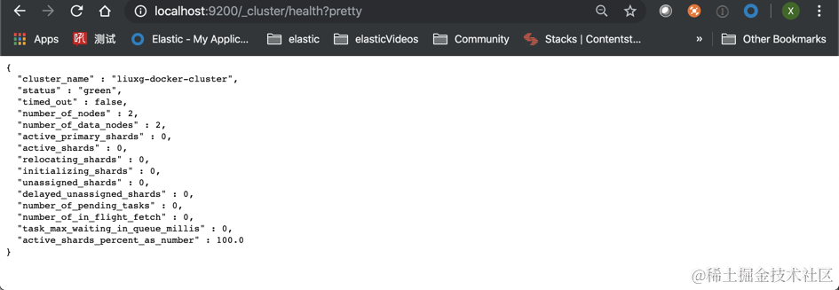 在这里,我们创建了一个叫做liuxg-docker-cluster的Elasticsearch集群尽管里面目前只有一个node。