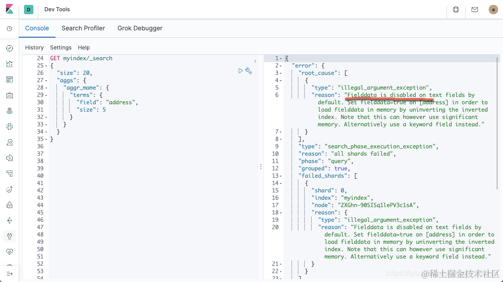 我们的 address 字段变为 aggregatable,也就是说我们可以对它进行做聚合分析尽管它没有 doc_values。
