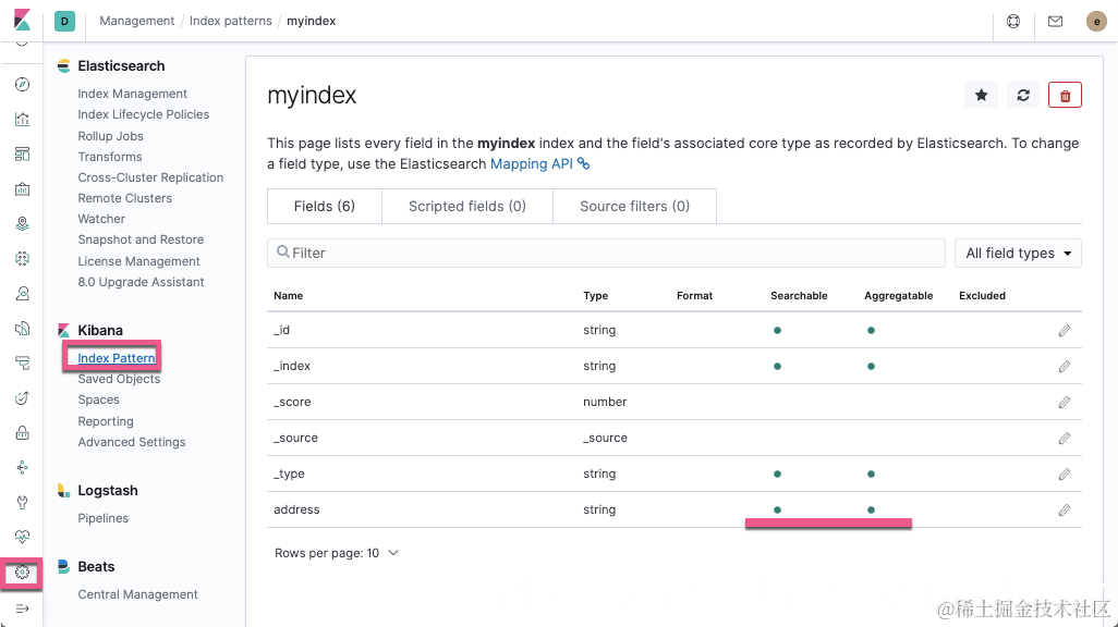 细心的开发者,如果这个时候去 Kibana 创建一个以 myindex 为索引的 index pattern,我们可以发现: