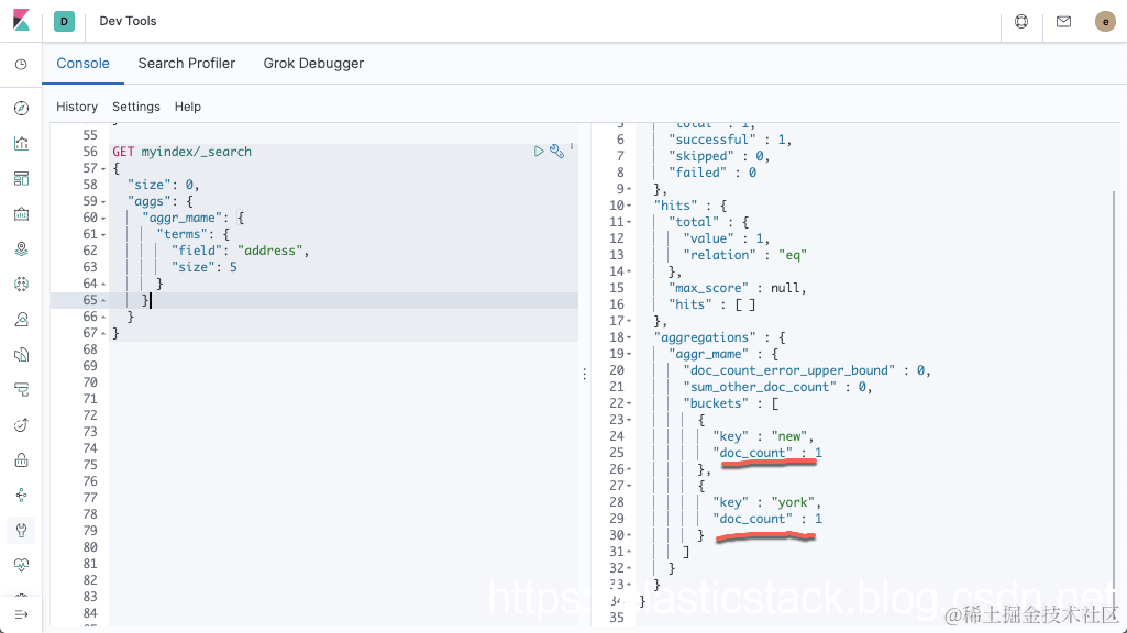 在索引之前会分析文本字段,以便可以通过搜索 new 或 york 来找到类似 New York 的值。 当您可能想要一个名为 New York 的存储桶时,此字段上的术语汇总将返回一个叫做 new 存储桶和一个叫做 york 存储桶。