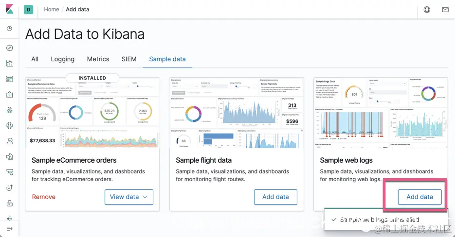 我们选用 Kibana 里带的官方的 Sample web logs 来作为我们的索引: