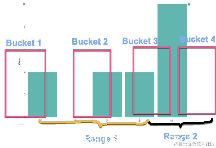 上面显示的第一个桶是26-27范围。因为27是在range 1里,由于range1里含有12个文档,所以返回的是12。同样针对key为28的情况,它的范围是28-29,由于29是在range1范围里,所以返回值也是12。对key为30的情况,因为它被包含在range1及range2里,那么返回的值等于range1及range2的总和,也就是22。针对key为32的情况,它的范围是32-34。因为32在range2里,而range2里只有10个文档,所以这个桶的值是range2的值,也就是10。