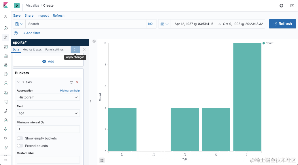 我们可以看出来在我们的文档里含有一个字段叫做 age_range 的。它定义了这个运动员所在的年龄范围。我们可以通过这个字段来对我们的数据进行统计: