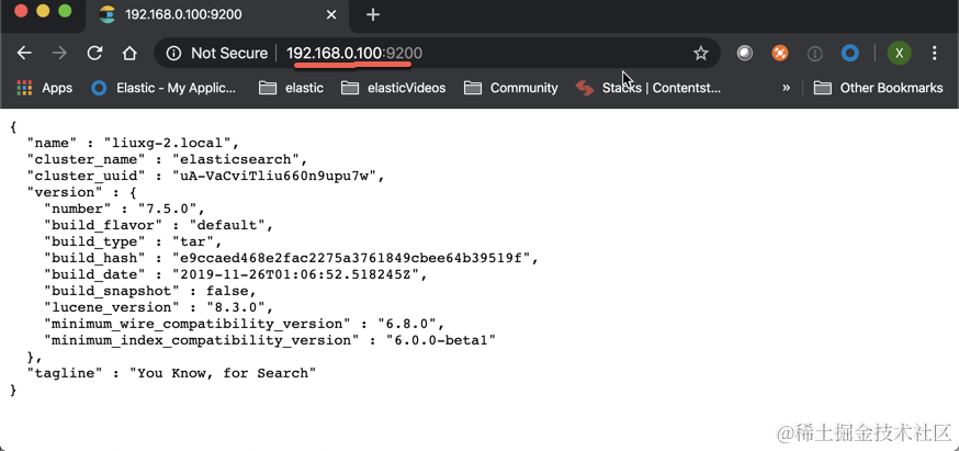 等修改完我们的 IP 地址后,我们保存 elasticsearch.yml 文件。然后重新运行我们的 elasticsearch。我们可以在一个浏览器中输入刚才输入的 IP 地址并加上端口号 9200。这样可以查看一下我们的 elasticsearch 是否已经正常运行了。