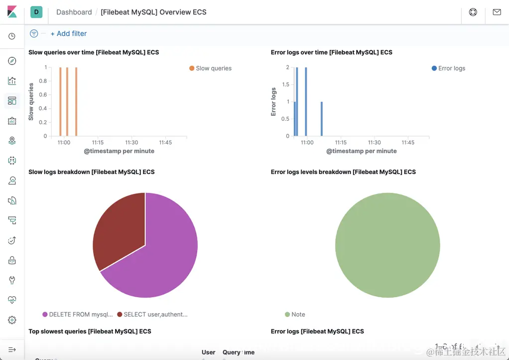 如本教程所示,Filebeat 是用于 MySQL 数据库和 Elasticsearch 集群的出色日志传送解决方案。 与以前的版本相比,它非常轻巧,可以有效地发送日志事件。 Filebeat 支持压缩,并且可以通过单个 yaml 文件轻松配置。 使用 Filebeat,你可以轻松地管理日志文件,跟踪日志注册表,创建自定义字段以在日志中启用细化过滤和发现,以及使用 Kibana 可视化功能立即为日志数据进行展示。