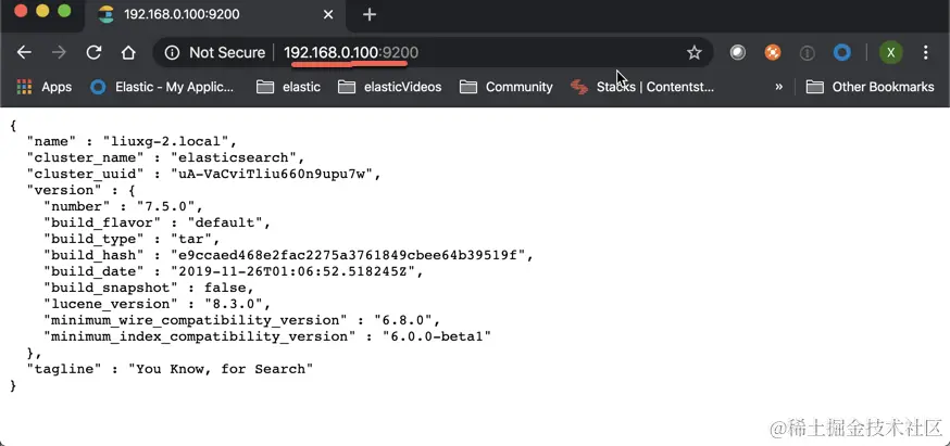 等修改完我们的 IP 地址后,我们保存 elasticsearch.yml 文件。然后重新运行我们的 elasticsearch。我们可以在一个浏览器中输入刚才输入的IP地址并加上端口号9200。这样可以查看一下我们的 elasticsearch 是否已经正常运行了。