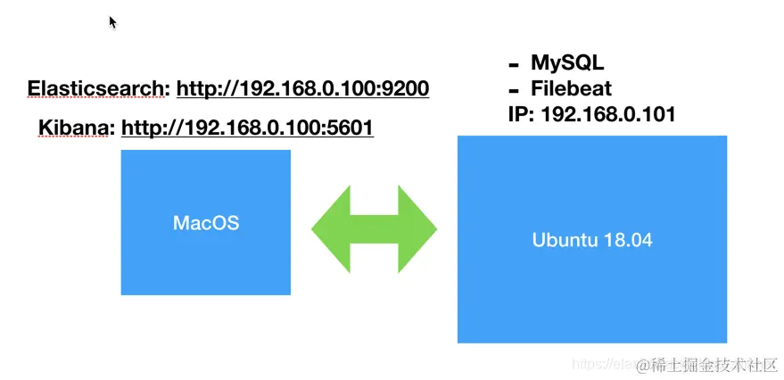 我有一台 MacOS 机器。在上面我安装了 Elasticsearch 及 Kibana。在这个机器里,我同时安装了一个 Ubuntu 18.04 的虚拟机。在这个 Ubunutu 机器上,我安装了 MySQL 及Filebeat。它们的IP地址分别显示如上。针对你们自己的测试环境,你们的IP地址可能和我的不太一样。