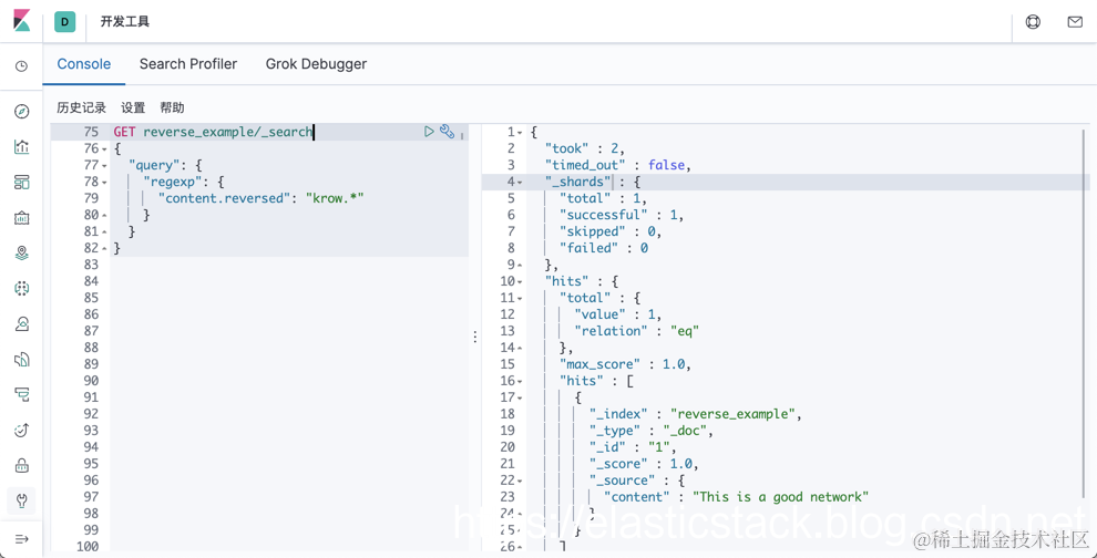 在这里 content 是一个 multi-field 的字段。content.reversed 将使用 whitespace_reverse 分析器来对我们的字段进行分词。这个分析器将会对术语进行倒序处理。比如: