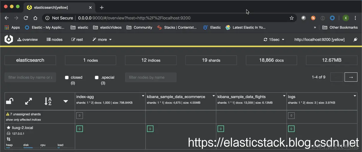 在上面它显示我们的 cluster 状态为 yellow,它表示我们需要更多的节点来分别我们的 shard。