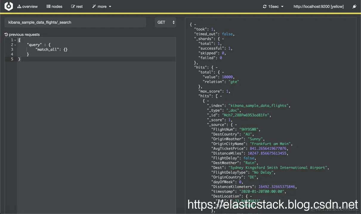 我可以在这个界面里发送我们想要的 DSL 查询请求。这里有点像我们的 Kibana Dev tools。只是在这里我们没有 auto-complete 功能。