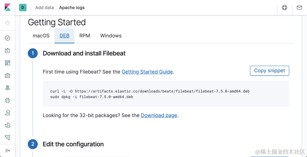 在上面,我们选择 DEB,因为 Ubuntu OS 是 debian 系统。按照上面的步骤,我们可以一步一步地安装 Filebeat。