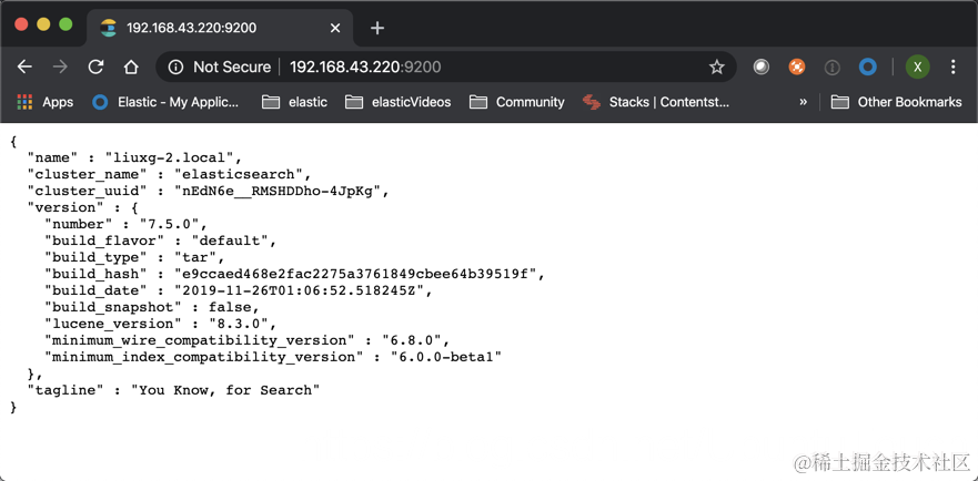 等修改完我们的 IP 地址后,我们保存 elasticsearch.yml 文件。然后重新运行我们的 elasticsearch。我们可以在一个浏览器中输入刚才输入的IP地址并加上端口号 9200。这样可以查看一下我们的 elasticsearch 是否已经正常运行了。