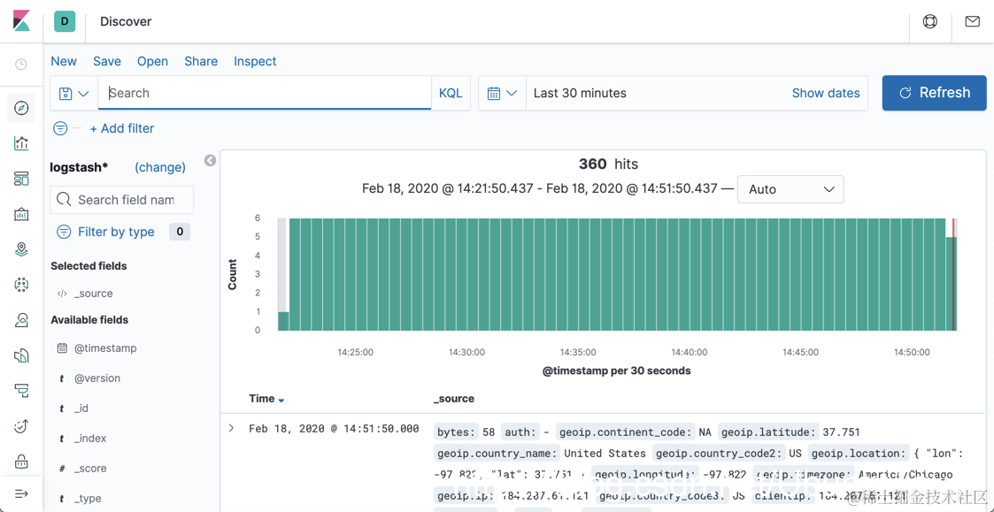 我们也可以通过创建一个 logstash 的index pattern 即可对我们的数据进行分析了。
