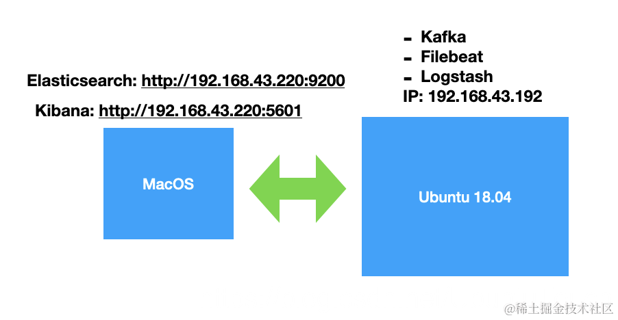在我的配置中,我使用了一个 MacOS 安装 Elasticsearch 及 Kibana。另外我使用另外一个 Ubuntu 18.04 来安装我的 Kafaka, Filebeat 及 Logstash。他们的IP地址分别如上所示。我们可以使用一个VM来安装我们的 Ubuntu 18.04。