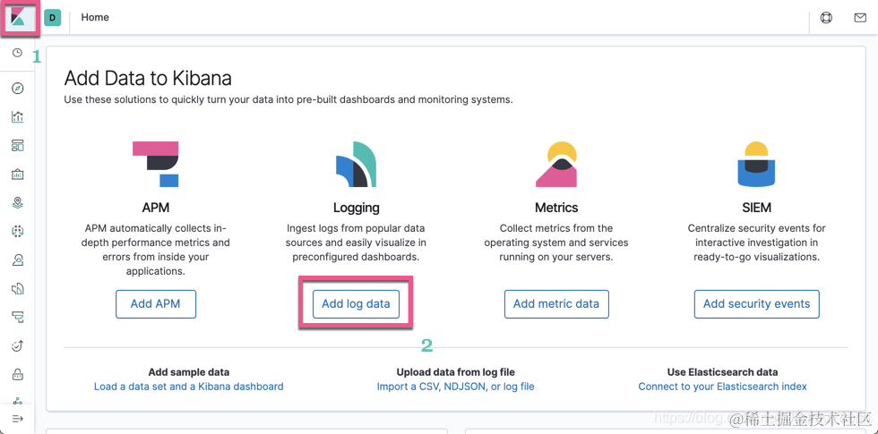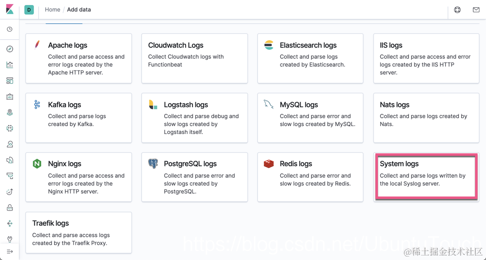由于 Filebeat 是 log 相关的,所以我们需要选择 “Add log data”。我们想对系统(System)日志进行监控,所以,我们选择 “System logs”: