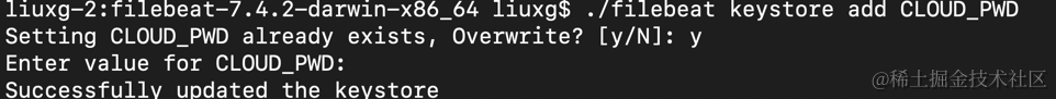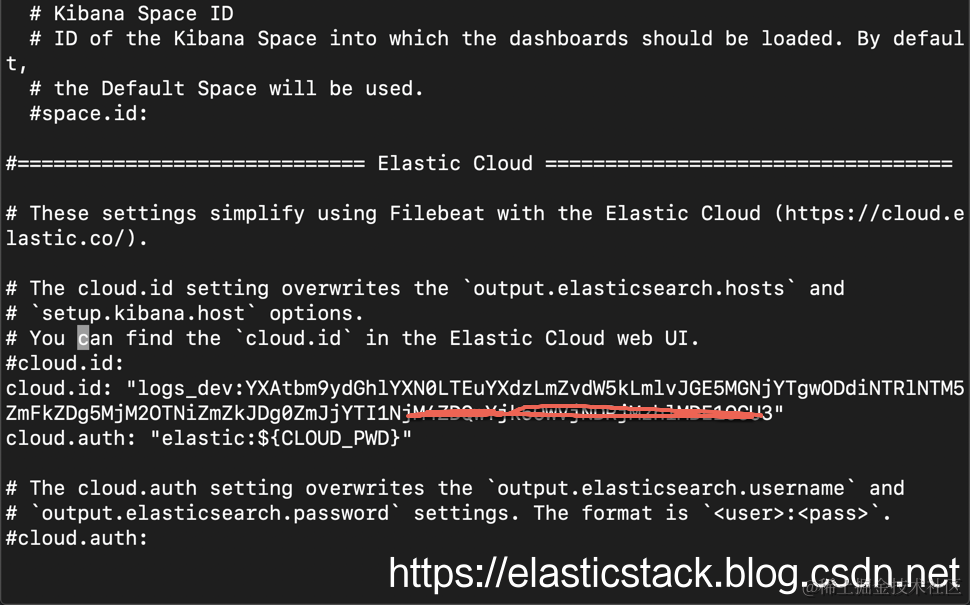 如下的配置只限于 Elastic Cloud。针对 Elastic cloud,我们可以避免把我们的用户名及密码写到我们的 filebeat.yml 文件中,我们可以使用 cloud.id 来及 keystore 管理来帮我们实现。