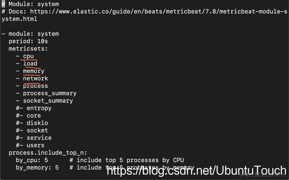 你也可显示这个模块中的某个 metricset,比如,我们可以在 ./modules.d/system.yml 中可以看到如下的一些 metricsets: