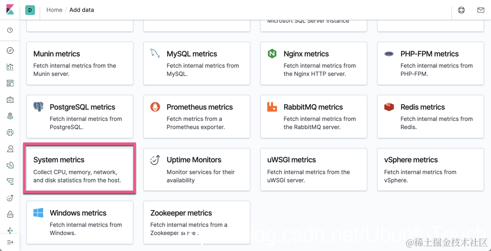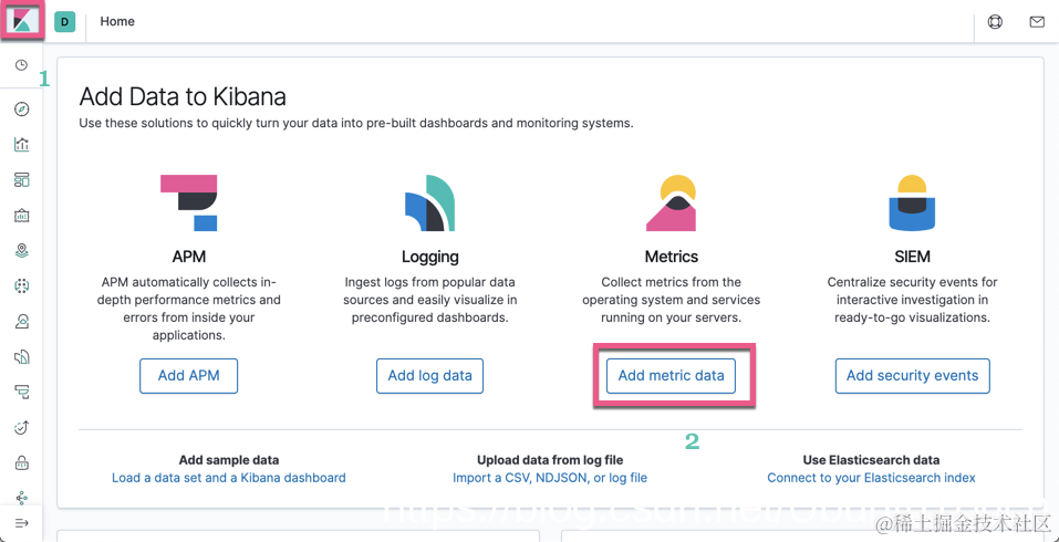由于 Metricbeat 是属于 Metrics 范畴,所以我们选择 “Add metric data”: