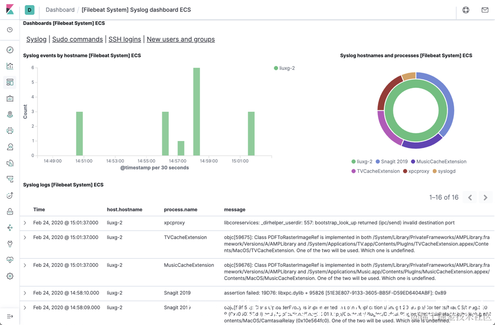 在上面它展示了我的电脑里的 Syslog 的所有 log 信息。我们也可以在上面选择 “Sudo commands”,“SSH logins” 及 “New users and groups” 分别进行查看。