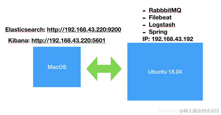 在上面我们把 Elastic Stack 的 Elasticsearch 和 Kibana 放到 MacOS 上,我们把其它的部分放到一个 Ubuntu OS 上。
