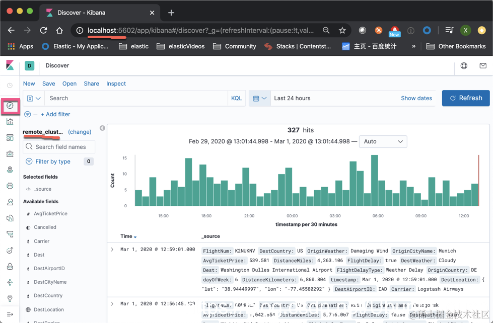 因为我们的默认的 index 是 remote_cluster:kibana_sample_data_flights,所以我们的 Discover 默认的情况先显示的是所有关于位于 cluster_1 上的 kibana_sample_data_flights 索引数据。我们可可以在 cluster_2 对这些数据进行分析。