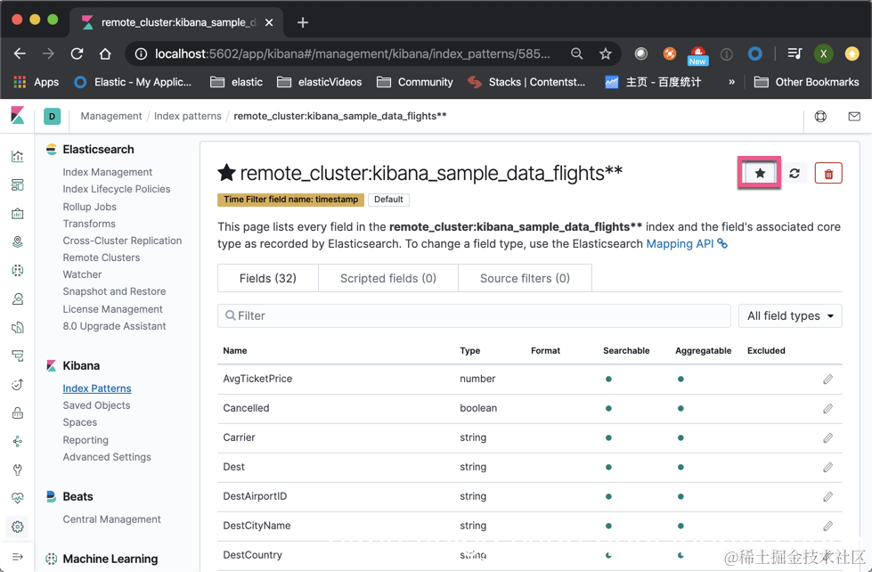 这样,我们就创建了位于 cluster_1 里的索引的一个 index pattern。我们点击右上角的星号,并使之成为我们的默认的 index。