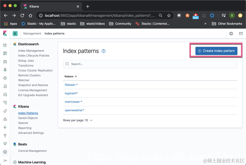 点击 “Create index pattern”: