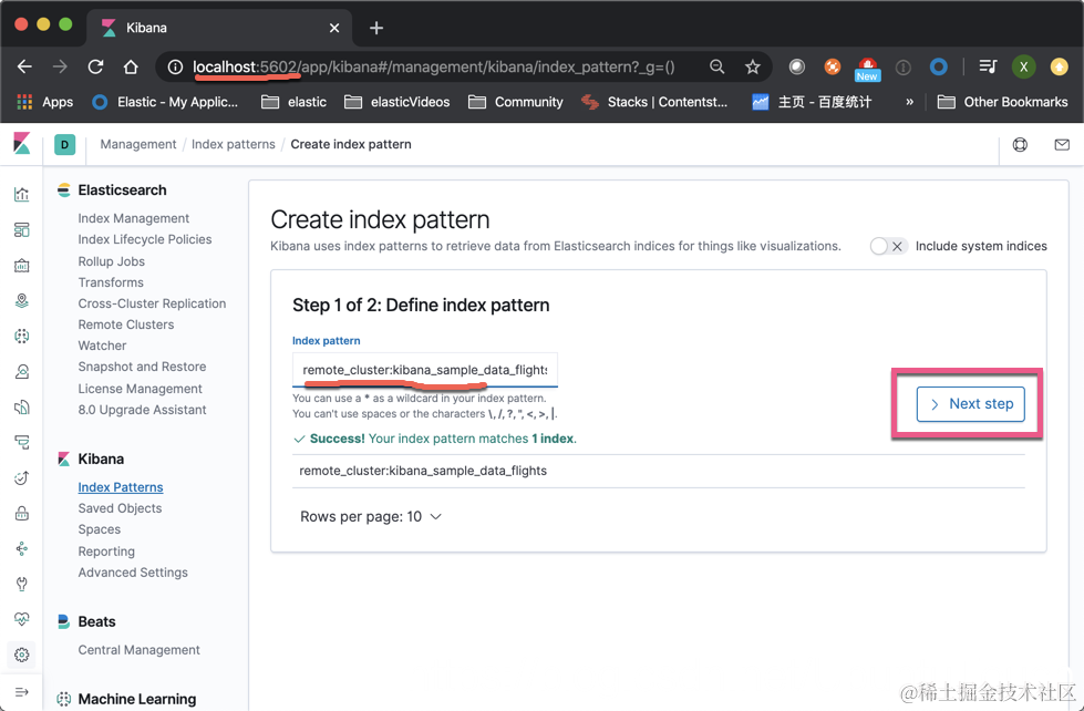 在上面,如果我们有本地和远程相同类型的索引(比如,我们针对不同地区的服务器来收集数据),我们可以使用逗号“,”把所有的索引放在一起做成一个 index pattern,比如就像:remote_cluster:kibana_sample_data_flights, my_local_index。