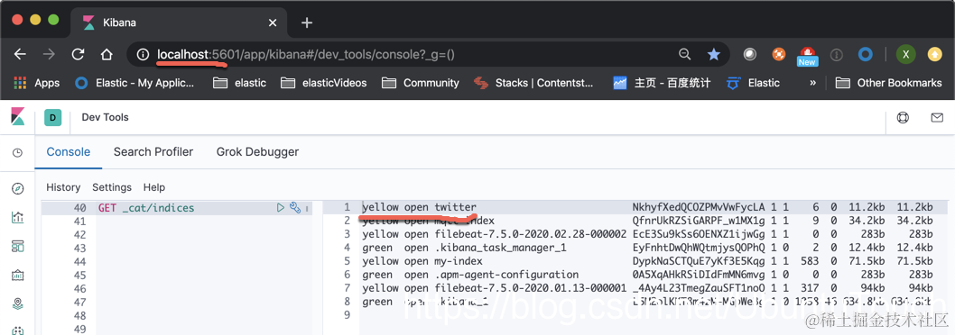 我们可以在 Kibana_1 中通过如下的命令来检查 twitter 索引是否已经被成功创建:
