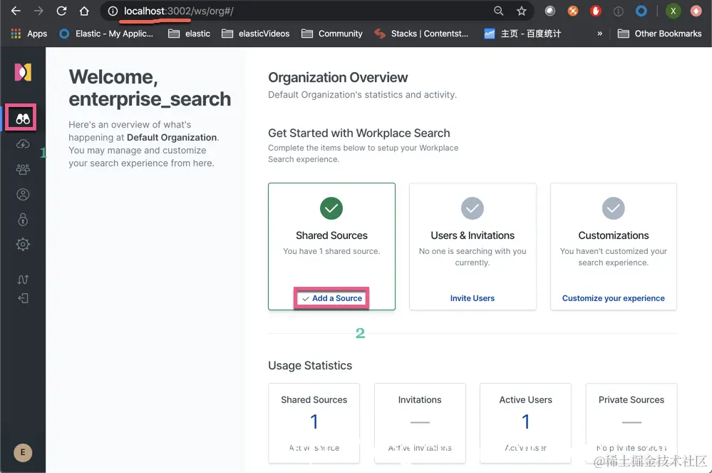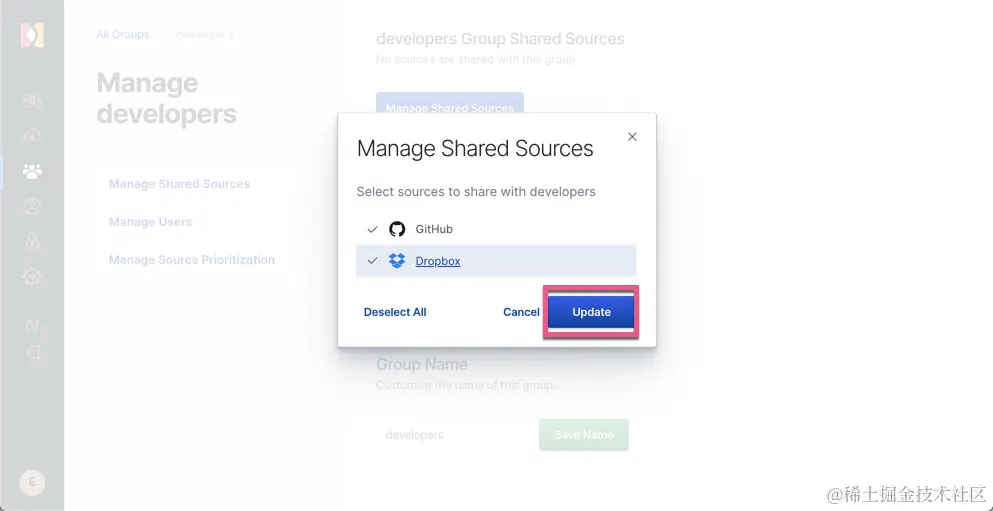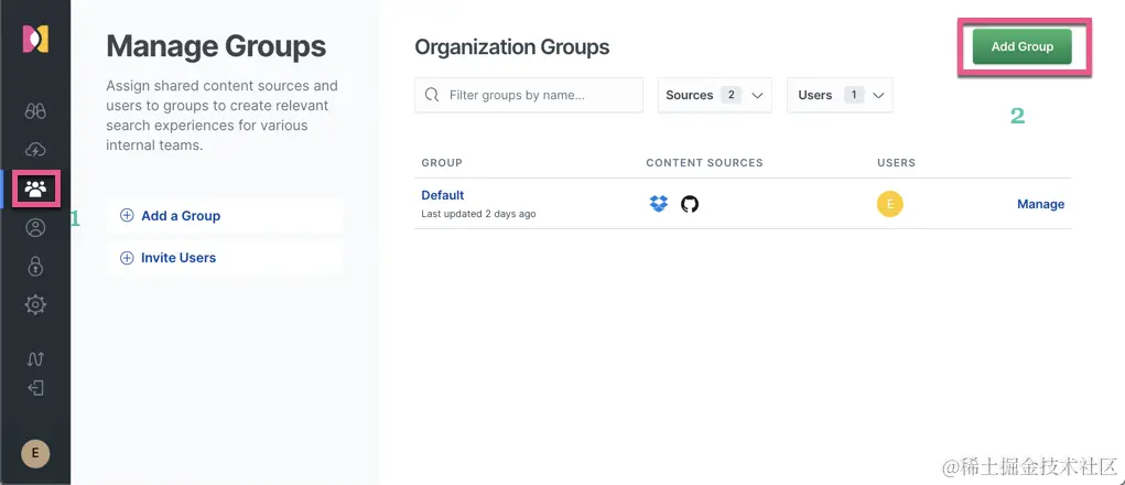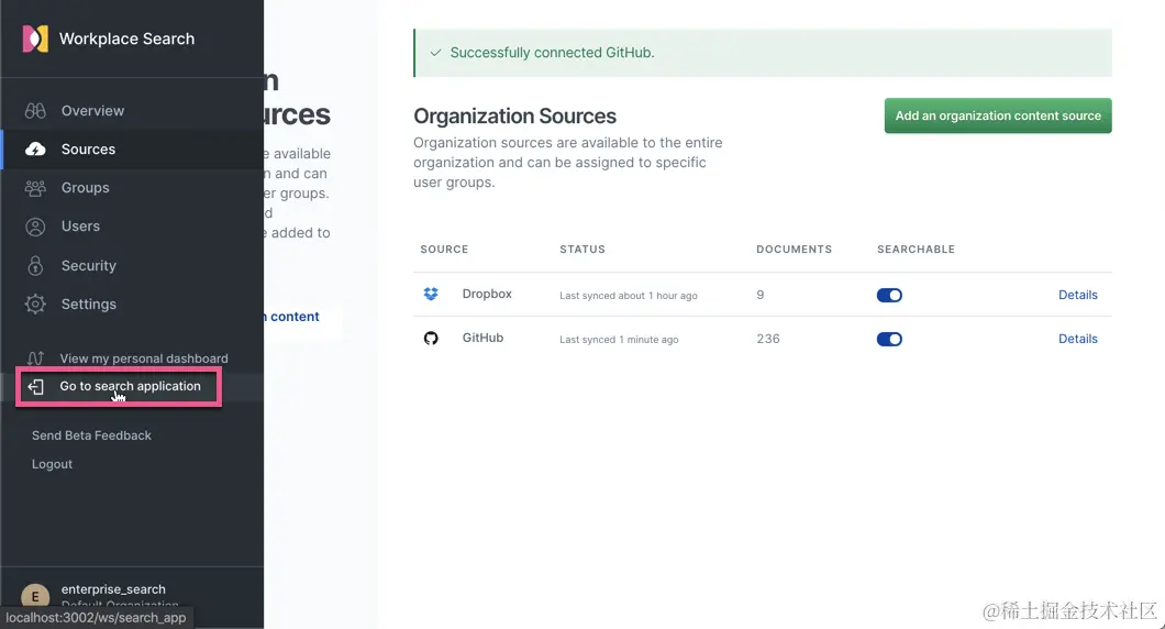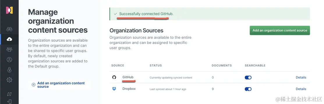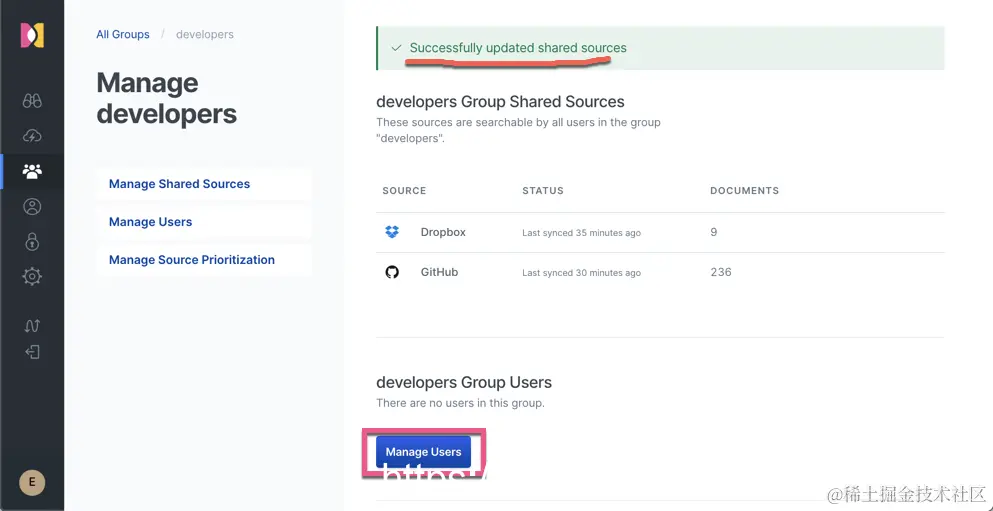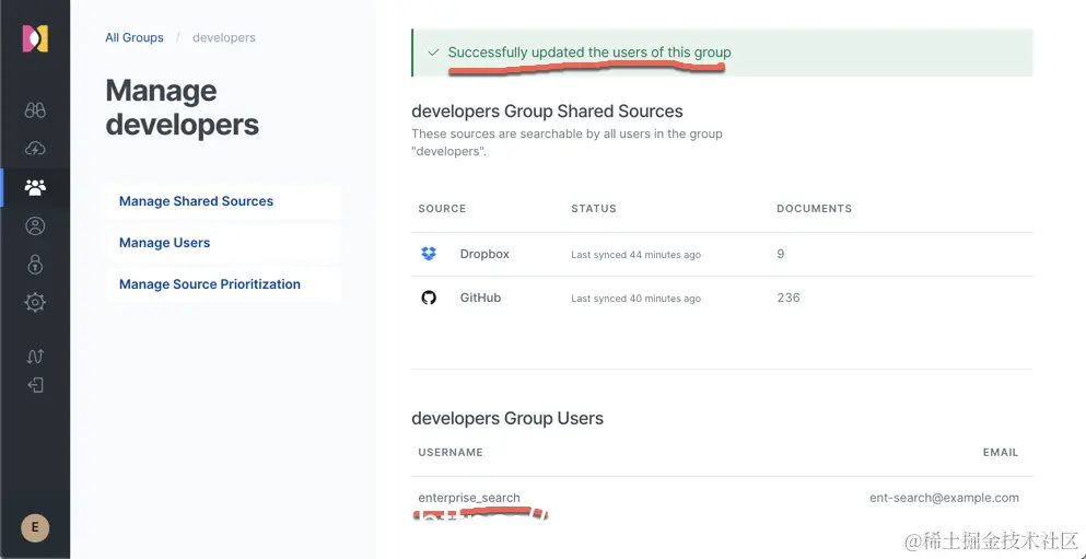 上面显示,我们新创建的 developers 组,含有 Dropbox 及 GitHub 两个源,同时它可以被 enterprise_search 用户所访问。