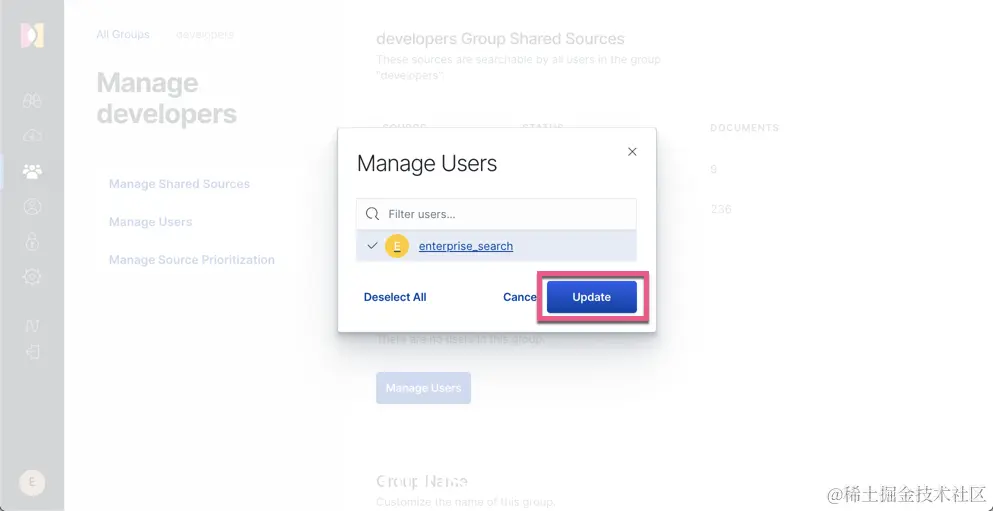 我们可以针对这个组选择我们可以搜索的源。通过这个方法,我们对不同的组赋予不同的搜索权限。点击上面的 “Update”。