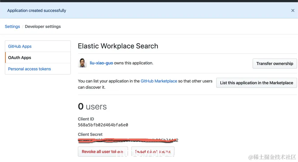 这样我们就生产了我们的 Elastic Workplace Search 应用。在上面,我们记录下生成的 Client ID 及 Client Secret 供一下的配置使用。这样我们就完成了 github 的应用创建。