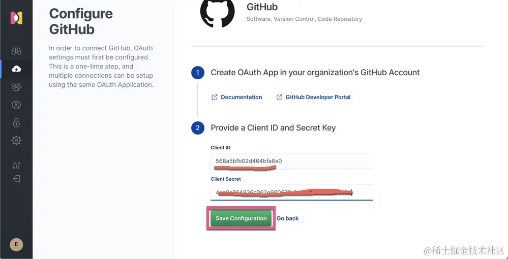 我们填入我们之前得到的 Client ID 及 Client Secret,并点击 “Save Configuration” 按钮: