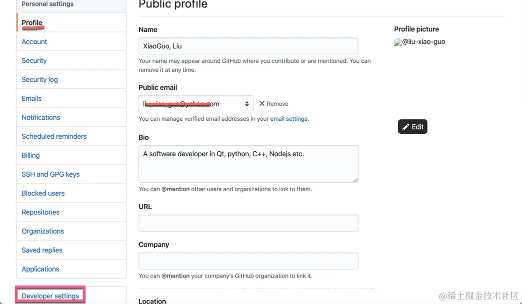 我们在左边的 Profile 的下面,可以找到 Developer settings 这个选项: