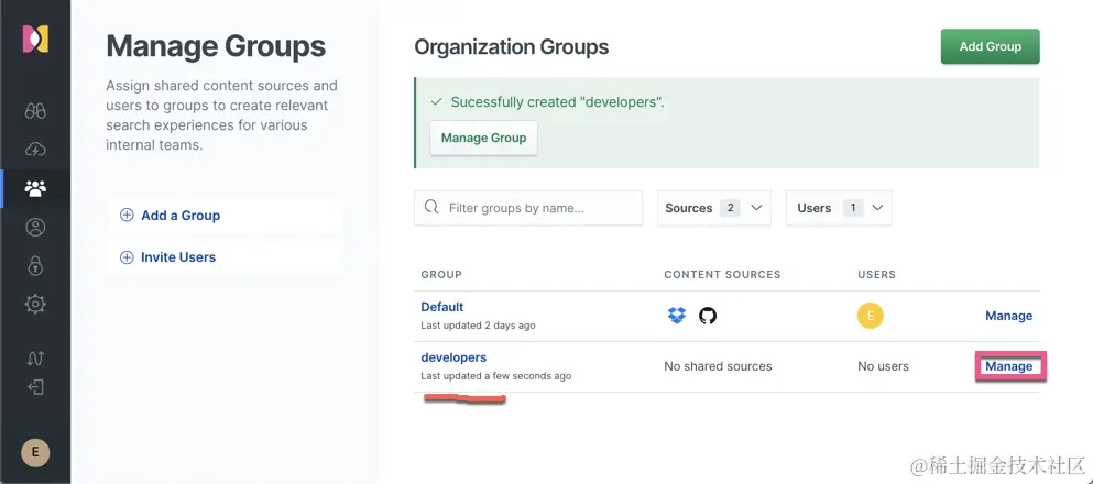 我们可以看见新创建的 developers 组。我们点击上面的 “Manage” 按钮: