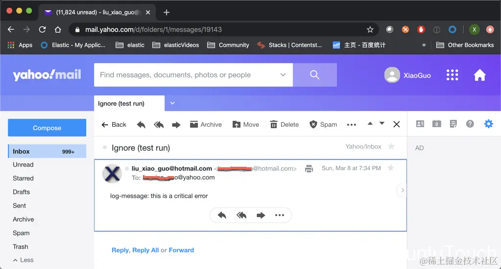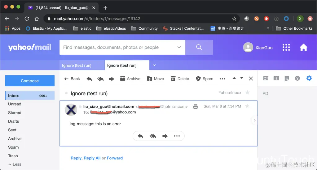 就像上面显示的那样,当我们输入“this”时,没有任何的输出,但是当我们输入“this is an error”时,我们可以看到一个输出,并可以同时看到一个添加的error到tags里去了。根据我们的设计,我们可以看出来,它应该同时发送一个邮件到我们指定的邮箱。