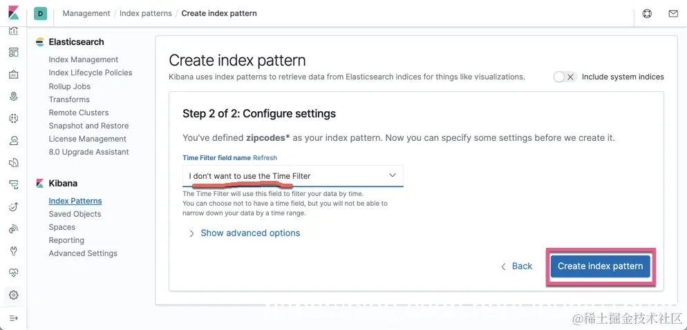因为这个不是一个时序的文档,所以我们选择 “I don't want to use the Timer Filter”。点击 “Create index pattern”: