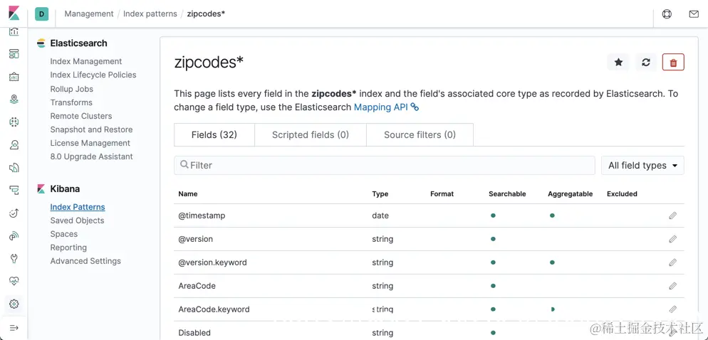 上面索引 template 表明:但凡 index pattern 为 zipcodes* 的索引将具有以上所定义的 settings,mappings 及 alias。在上面,我们把我们的 location 定义为一个 geo_point 的数据类型。